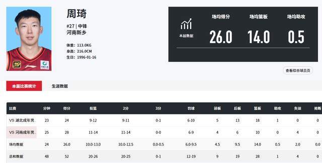 于是,我们就看到了,对阵湖北队,周琦打了23分钟,12投9中,10罚6中,砍下24分18篮板,率队63分大胜。对阵河南队,周琦打了25分钟,14投11中,9罚6中,砍下28分10篮板,率队24分大胜。