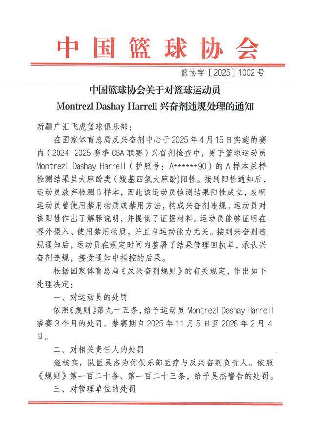 北京时间今日,中国篮协官方发布公告,上赛季效力于新疆男篮的外援蒙特雷兹-哈雷尔因兴奋剂违规被禁赛3个月,期限为2025年11月5日到2026年2月4日,新疆男篮则承担20例兴奋剂检测的费用共36000元。