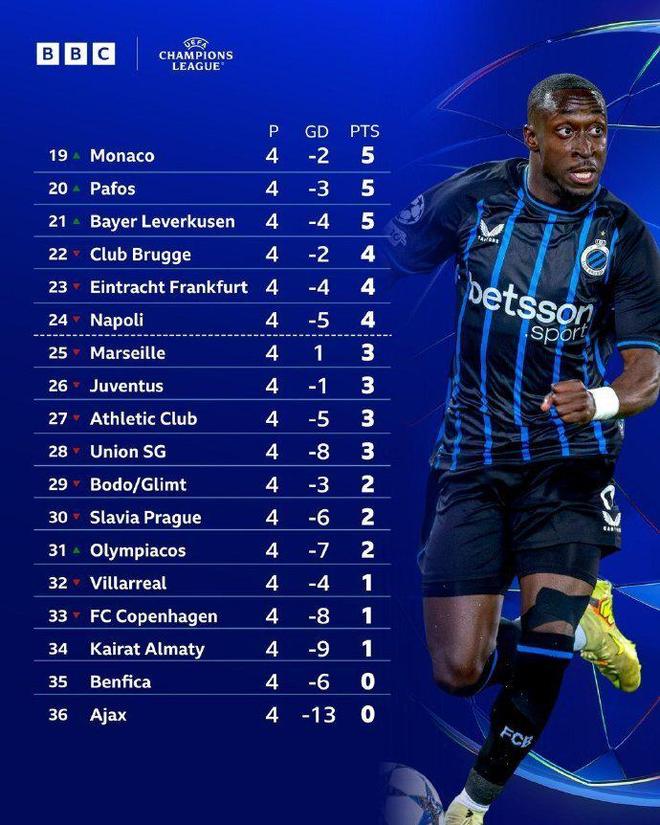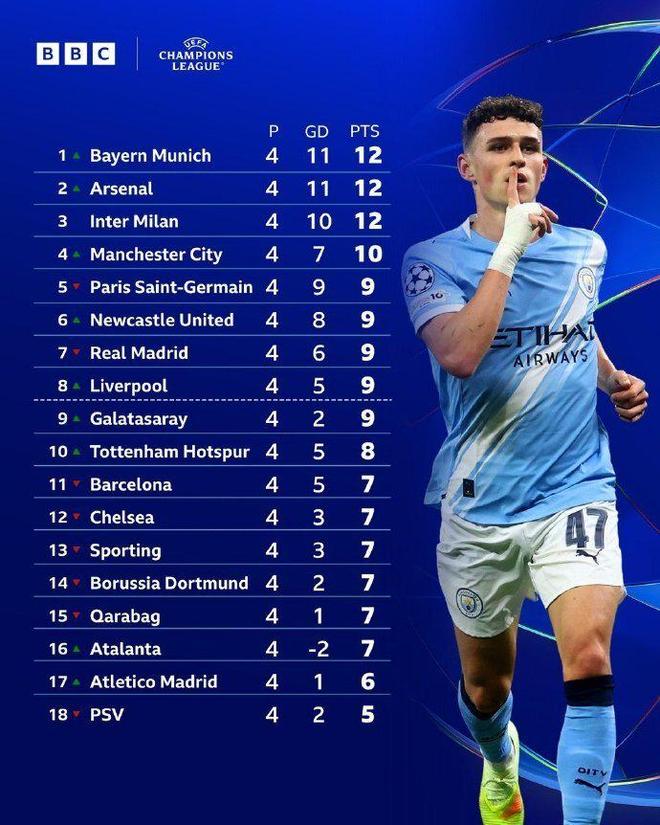 欧冠4轮后积分榜巨变!仅3队全胜+拜仁领跑,两支前冠军4连败垫底