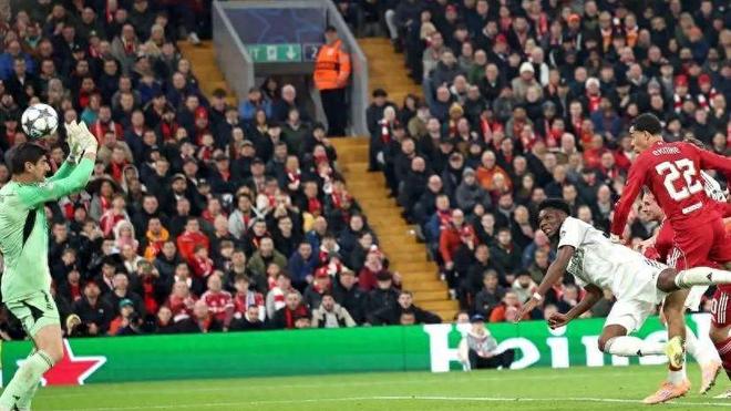 尽管皇马在安菲尔德的控球率(41%)略高于德比战(37%),但控球并未转化为控制力,反而屡屡被对手打反击,直接冲击库尔图瓦把守的大门。