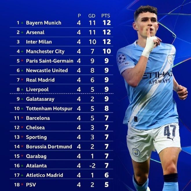 在这一比赛日出战的3支英超队中,曼城维持了稳定的发挥,他们在主场4-1横扫多特蒙德,开局4轮3胜1平保持不败。