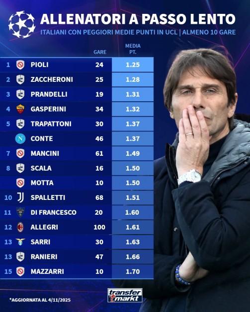 场均1.37分,执教至少10场欧冠的意大利教练中孔蒂成绩倒数第5