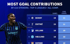 本赛季五大联赛U23前锋直接参与进球前10:博尼、埃基蒂克第1